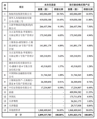 上述交易完成后,俞渝和李国庆将合计直接持有天海投资16.49%股份,分别取得天海投资新增股份中的 126,404,494股和54,173,355 股。