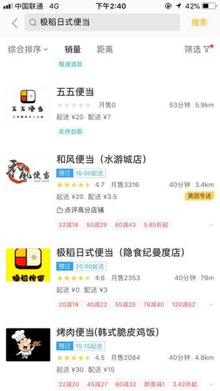 无论按照销量或是距离排行,杨先生的店铺都没有按照应有的顺序被列出,而是被40家以上的店铺压在下面。