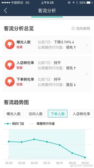 6月2号上午,店铺开张两个小时后,杨先生的妻子发现店铺排行持续下滑。从商圈前三,跌出了排行榜。